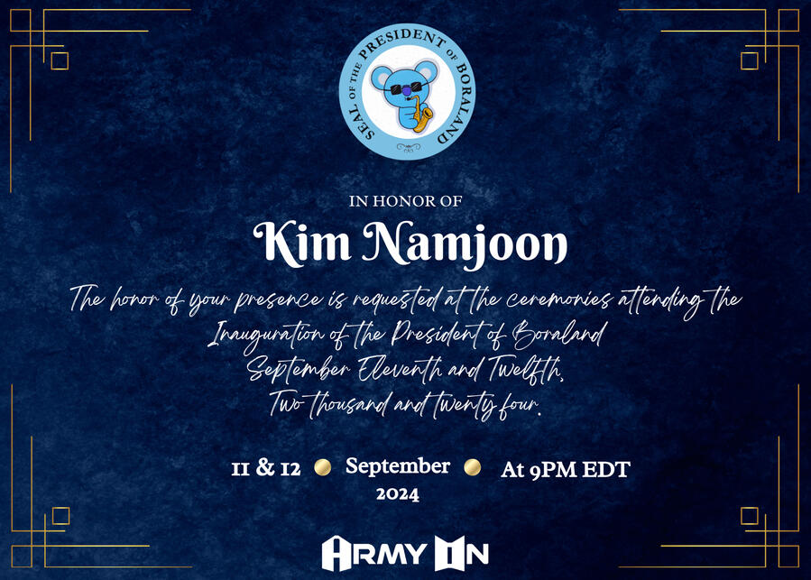 After check out, you are invited to join Boraland's festivities celebrating President Kim Namjoon! Will you be attending? Make sure to RSVP below!